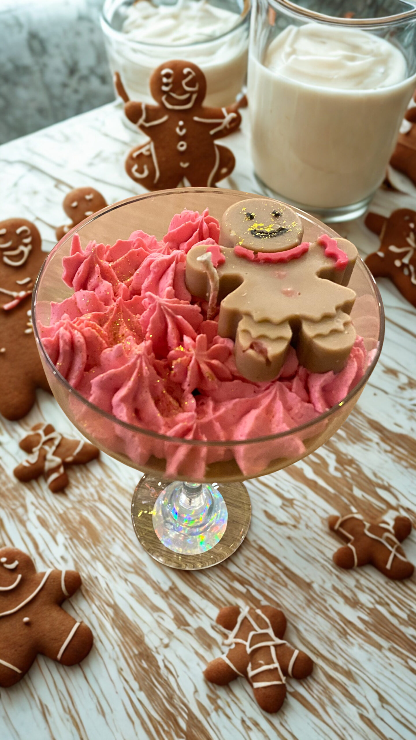 Hand-poured in a clear coupe glass and topped with whipped wax and a cute gingerbread-style topper for a magical, cozy aesthetic.
